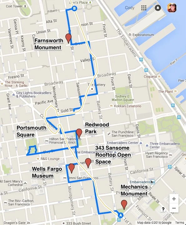 - There are a number of Privately Owned Public Open Spaces (POPO’s) around downtown. Stopping in at Empire Park at the base of the Transamerica Pyramid is on our route, but also the rooftop at 343 Sansome is pretty cool. https://www.spur.org/sites/default/files/migrated/anchors/popos-guide.pdf
