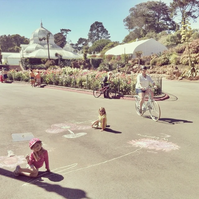 Sunday it’s supposed to be 75º in Golden Gate Park. Something we enjoy there is riding out bikes on JFK Drive which is closed to traffic on Sunday’s (except for a shuttle bus and service vehicles). It’s kind of a party on wheels and it’s quite fun to just roll up and down here and see what’s going on. The Rose Garden is a nice stop, pull out the picnic blanket and have a snack. Our favorite spot is the Dahlia garden adjacent to the Conservatory of Flowers, and they should be in bloom now. The last time we visited I had some sidewalk chalk with me and the kids drew giant dahlias on the road surrounding the garden. It was delightful seeing them create their own dahlias as they can come in so many shapes and configurations.